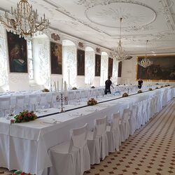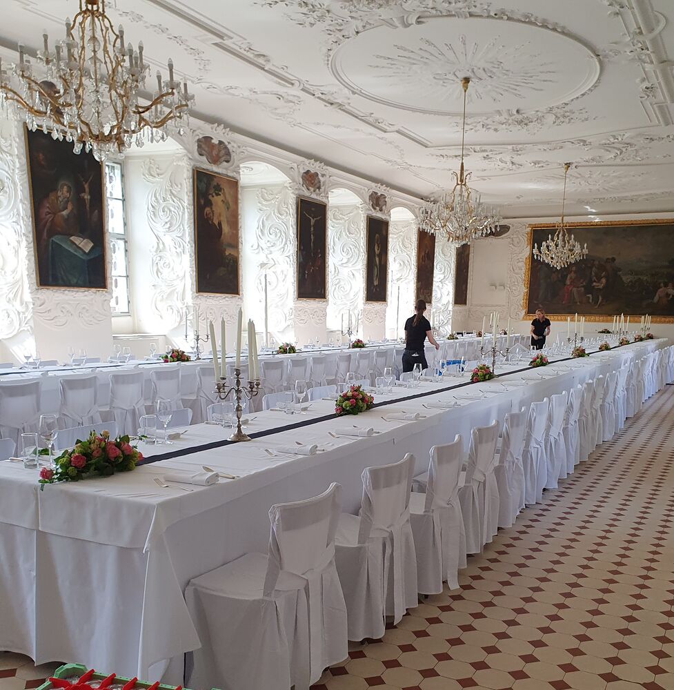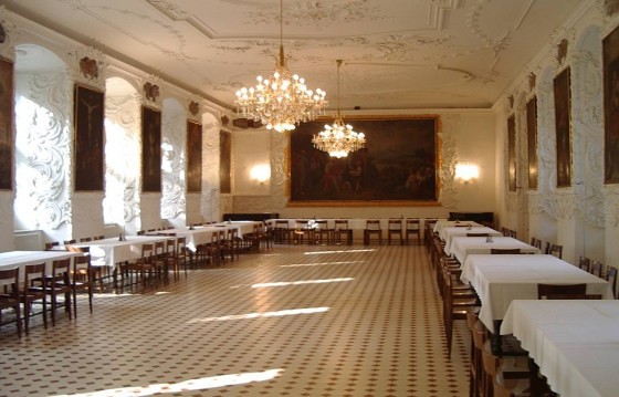 Gleichzeitig mit dem Jesuitenbibliothekssaal (heute Barocksaal) wurde das im ersten Stock des NW-Flügels befindliche Refektorium im barocken Sinne prunkvoller ausgestaltet. Schon das Holzportal weist auf den Innenseiten Doppelsäulen und aufwendige Schnitzereien sowie Einlegearbeiten auf. Zu beiden Seiten des langgestreckten Saales öffnen sich Fenster zum ehem. Universitätshof bzw. in den rückwärtigen Garten, die durch das hier höhere Niveau von außen gesehen ebenerdig liegen. Die Fensternischen sind mit großlappigen Akanthusstuck überzogen. An den Wänden zwischen den Fenstern hängen monumentale Gemälde mit Heiligendarstellungen, die kleinen Stuckkartuschen darüber zeigen Name und Wappen der ursprünglichen Spender. Wegen Baugebrechen musste die Decke im Jahre 1904 ausgewechselt werden. Der Raum hat dennoch seine barocke Repräsentanz bewahrt und dient glücklicherweise immer noch seiner ursprünglichen Funktion entsprechend - als Speisesaal.