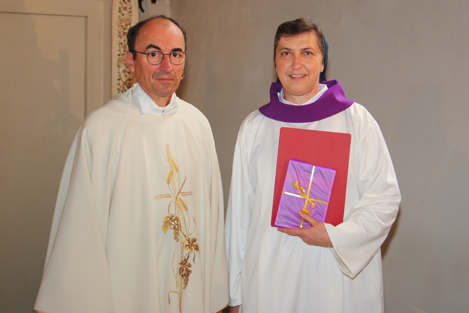 Und auch Sr. Maria beginnt einen neuen Dienst: Sie wurde nach einer Ausbildung vom Bischof als Begräbnisleiterin in die Pfarre gesendet und bekam von Pfarrer Hans Karner das Dekret dafür im heutigen Gottesdienst überreicht. Dabei trug sie eine weiße Albe mit einem violetten Kragen, wie es für Begräbnisleiterinnen vorgesehen ist.