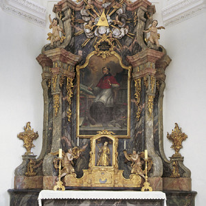 Die nördlich an den Chorraum anschließende, rechteckige Sakristei wurde 1636/37 errichtet, ein in die Südwand eingelassenes Marmorlavabo ist auf 1637 datiert.